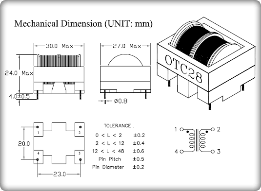 REFERENCE RATING (2 GROOVES BOBBIN) | | | INDUCTANCE (L) mH Min. | D.C.R. mOHM Max. | RATE CURRENT Amp(ac)REF. | WIRE DIA.ψ (mm) | REMARK | | FOTC2810000500A | 5.0 | 40